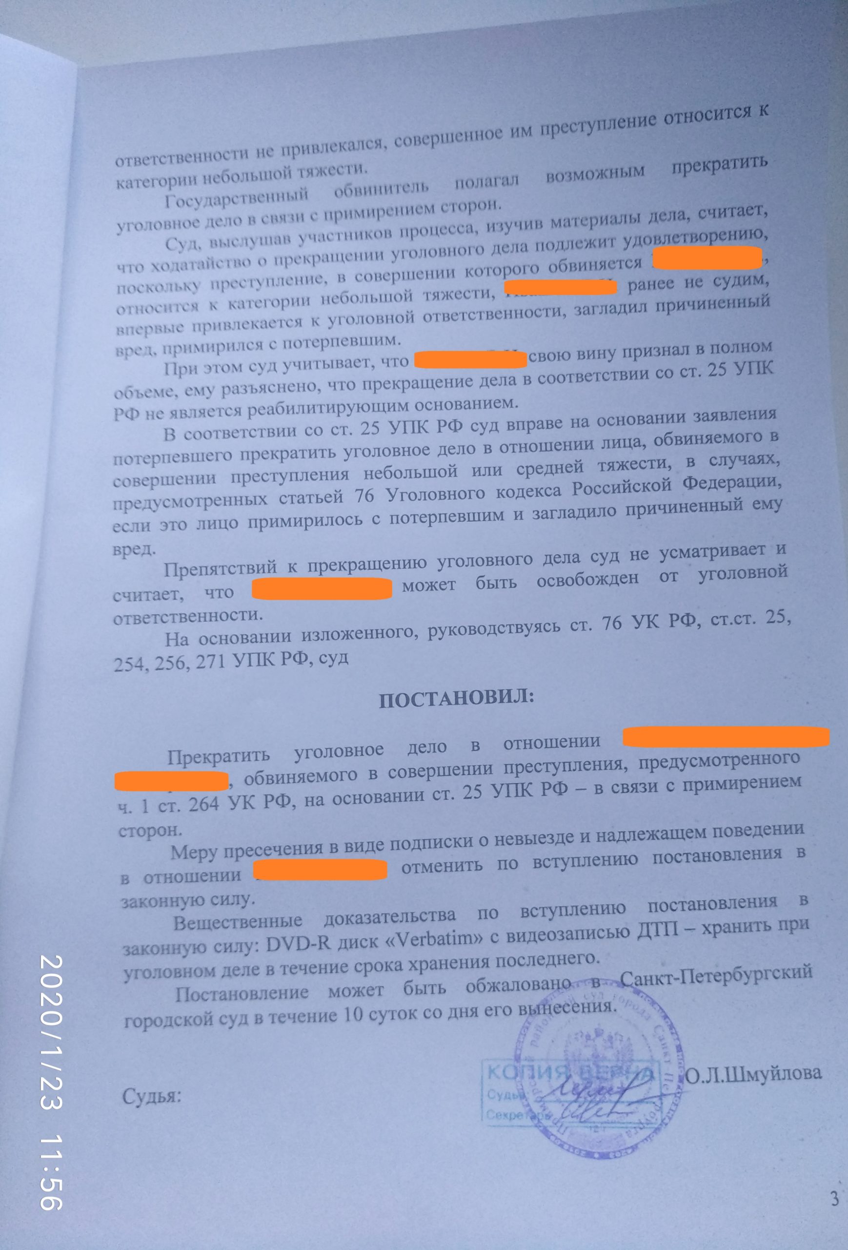 В суде дела прекращают. Прекратить уголовное дело за примирением сторон можно не только по первой части, но и по второй и третьей части ст. 264 УК РФ. Главное, чтобы преступление было совершено впервые и был заглажен материальный вред потерпевшему.