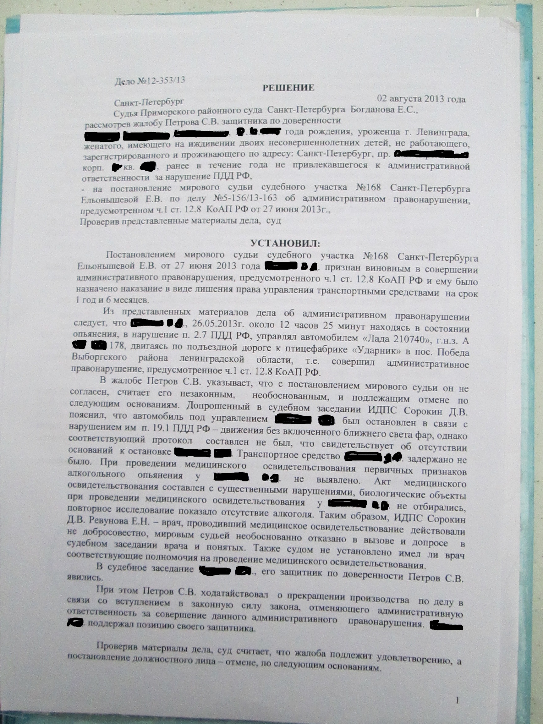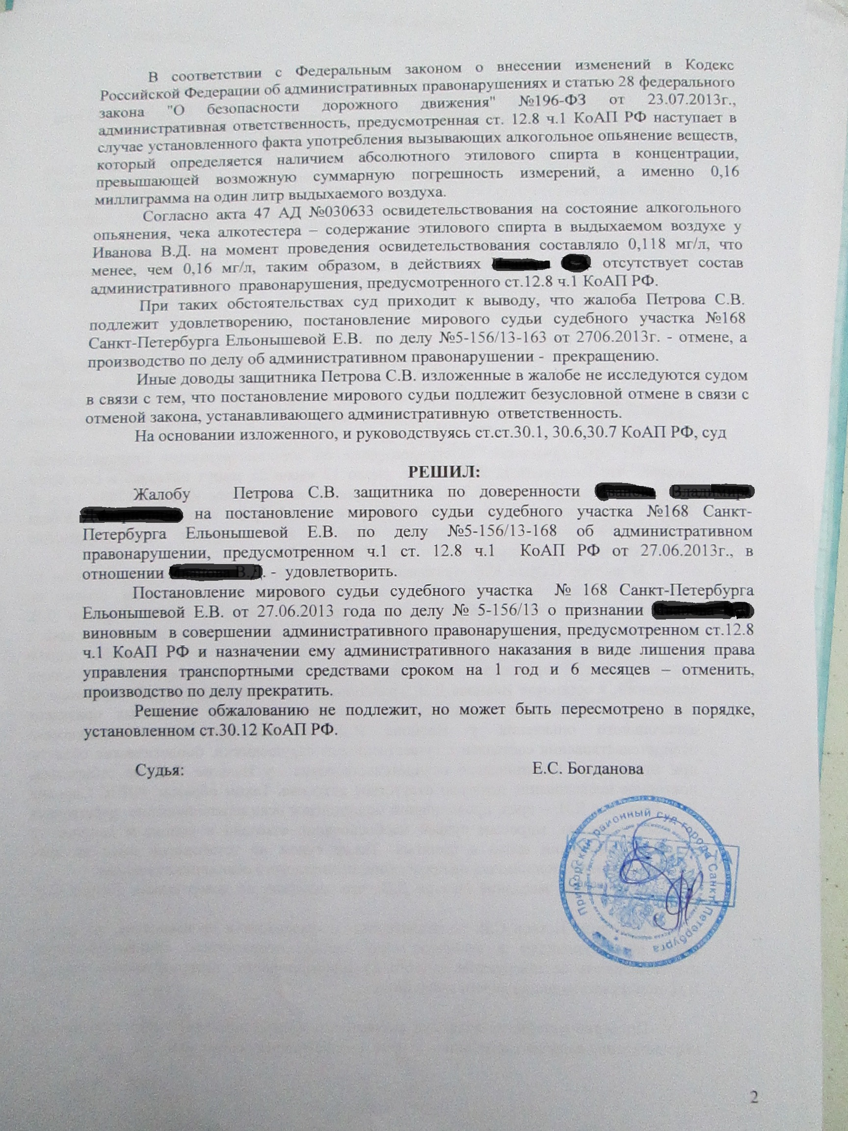 Суд лишил прав при показаниях прибора 0.11 промилле на 1 год 6 месяцев. Это менее допустимых 0.16 установленных законом. Вернуть права помог адвокат по ДТП, подав жалобу в Приморский районный суд Санкт-Петербурга. Иногда приходится доходить и до Верховного суда РФ.