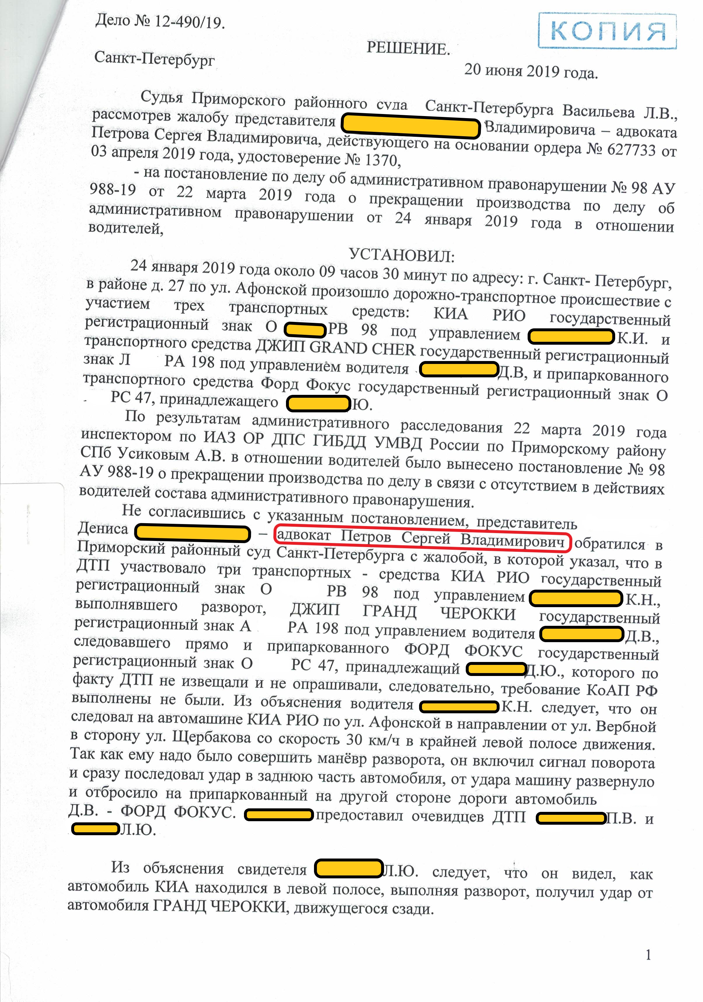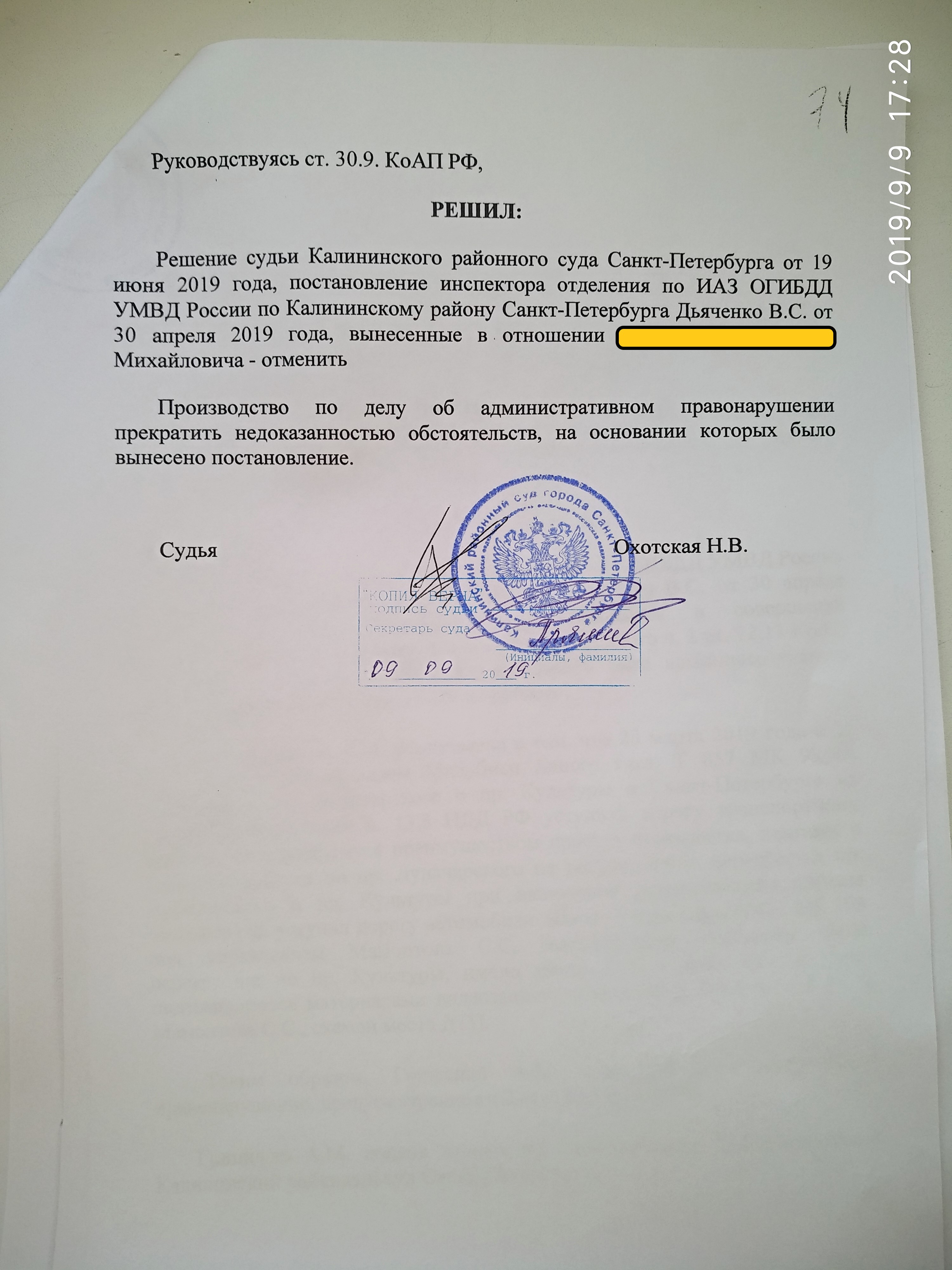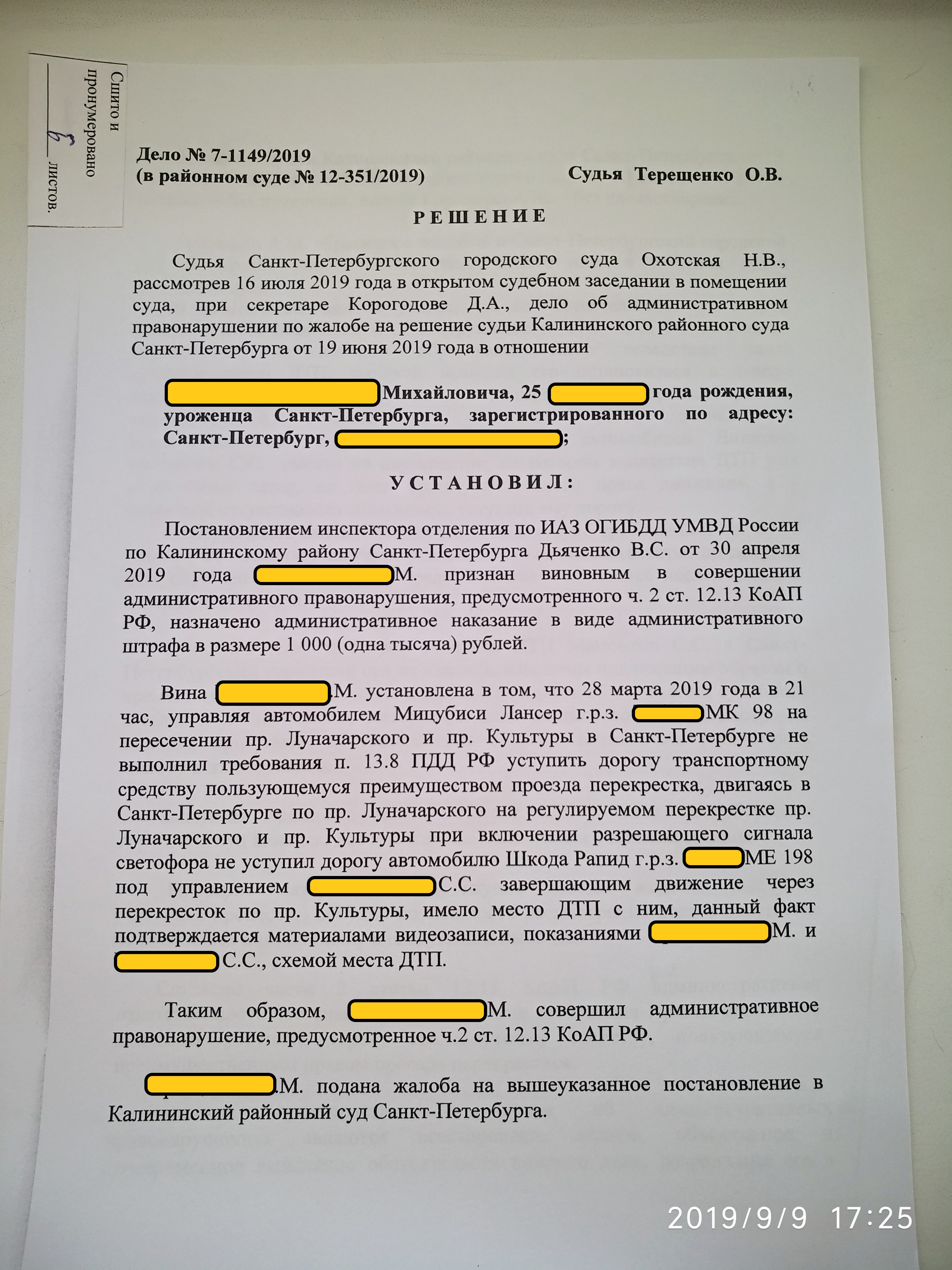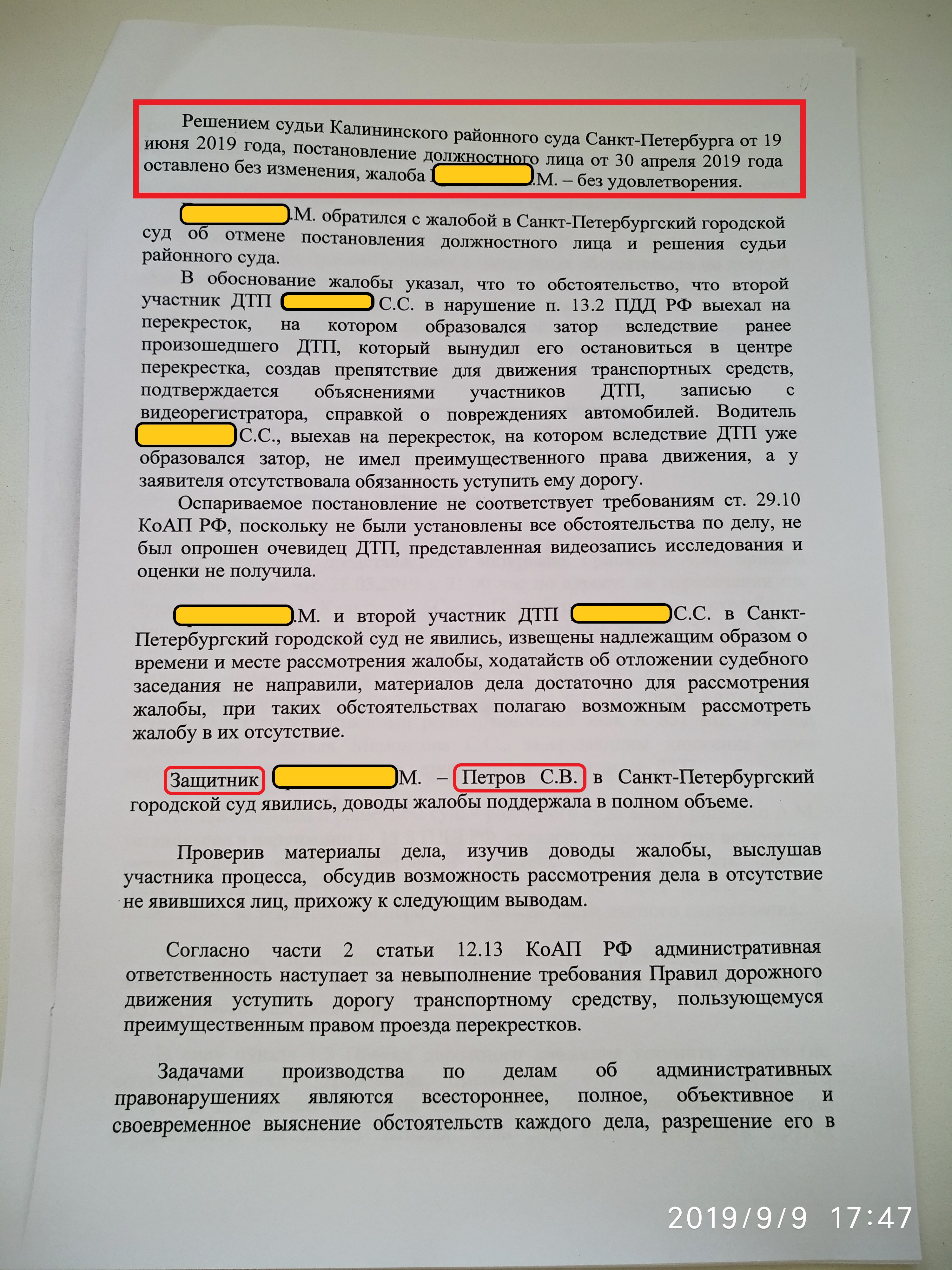 Тогда адвокат по ДТП оспорил решение Калининского районного суда в Санкт-Петербургский городской суд. Санкт-Петербургский городской суд, отменил постановление инспектора ГИБДД о виновности водителя. Дело прекратил за недоказанностью вины водителя.  Вследствие чего водитель получил выплату по ОСАГО. Он.