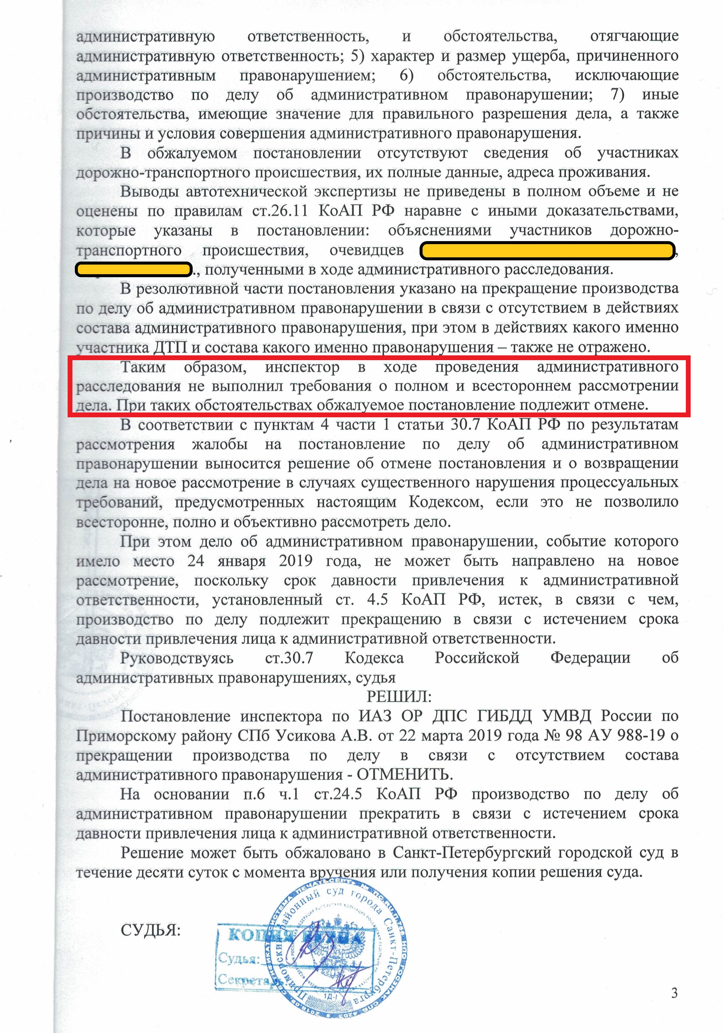 В другом случае инспектор ГИБДД по Приморскому району Санкт-Петербурга, вынес незаконное постановление о прекращении административного дела в связи с отсутствием состава административного правонарушения в отношении водителя нарушившего ПДД. Этим помог другому участнику ДТП уйти от ответственности за совершённое  ДТП. Адвокат по ДТП смог отменить постановление ГИБДД в Приморском районном суде Санкт-Петербурга. Суд отменил незаконное постановление, но так как срок привлечения к административной ответственности истёк, прекратил дело в связи с истечением срока давности привлечения к административной ответственности, и у нашего доверителя появилась возможность  установить вину второго участника ДТП в гражданском судопроизводстве.