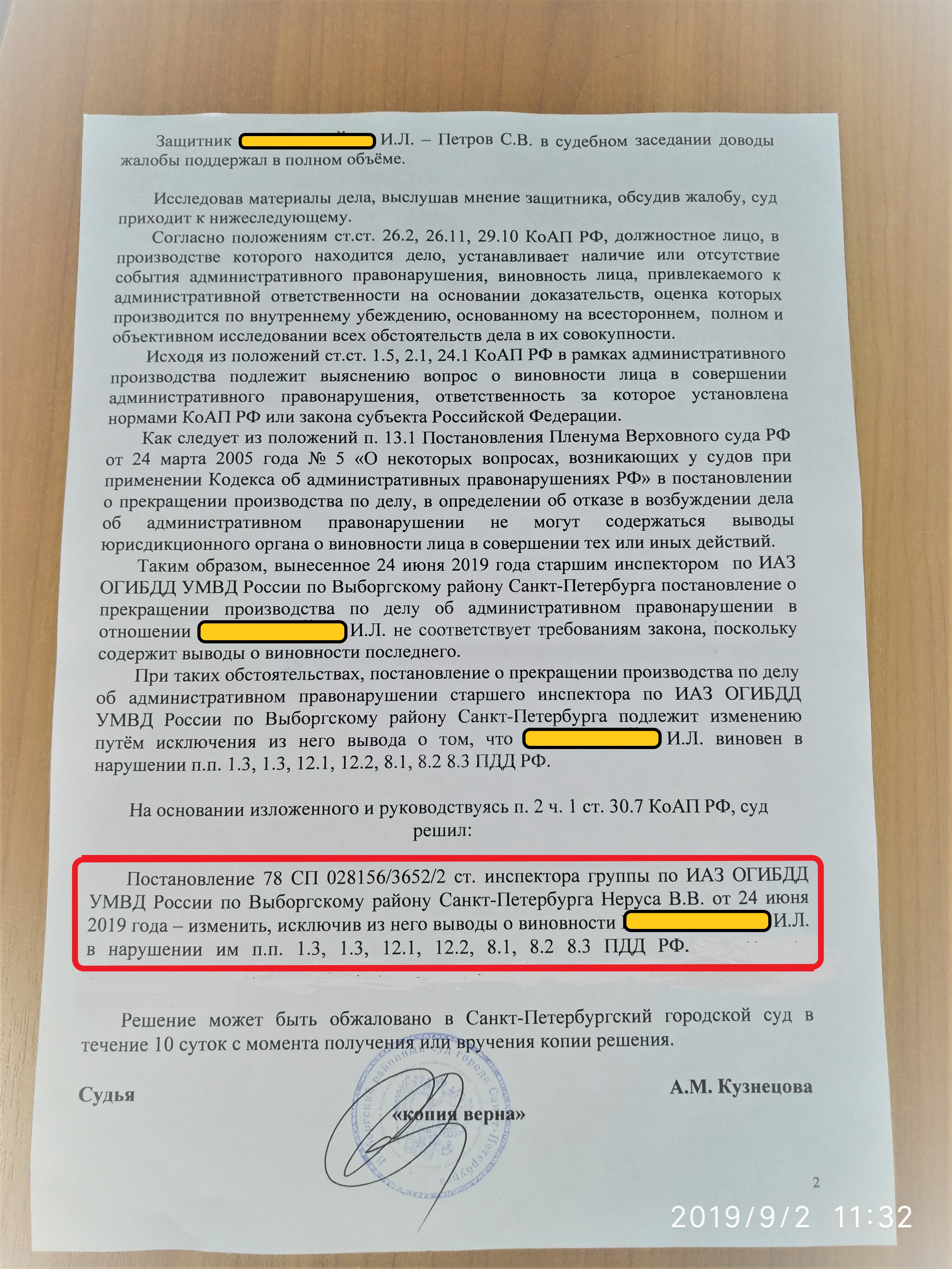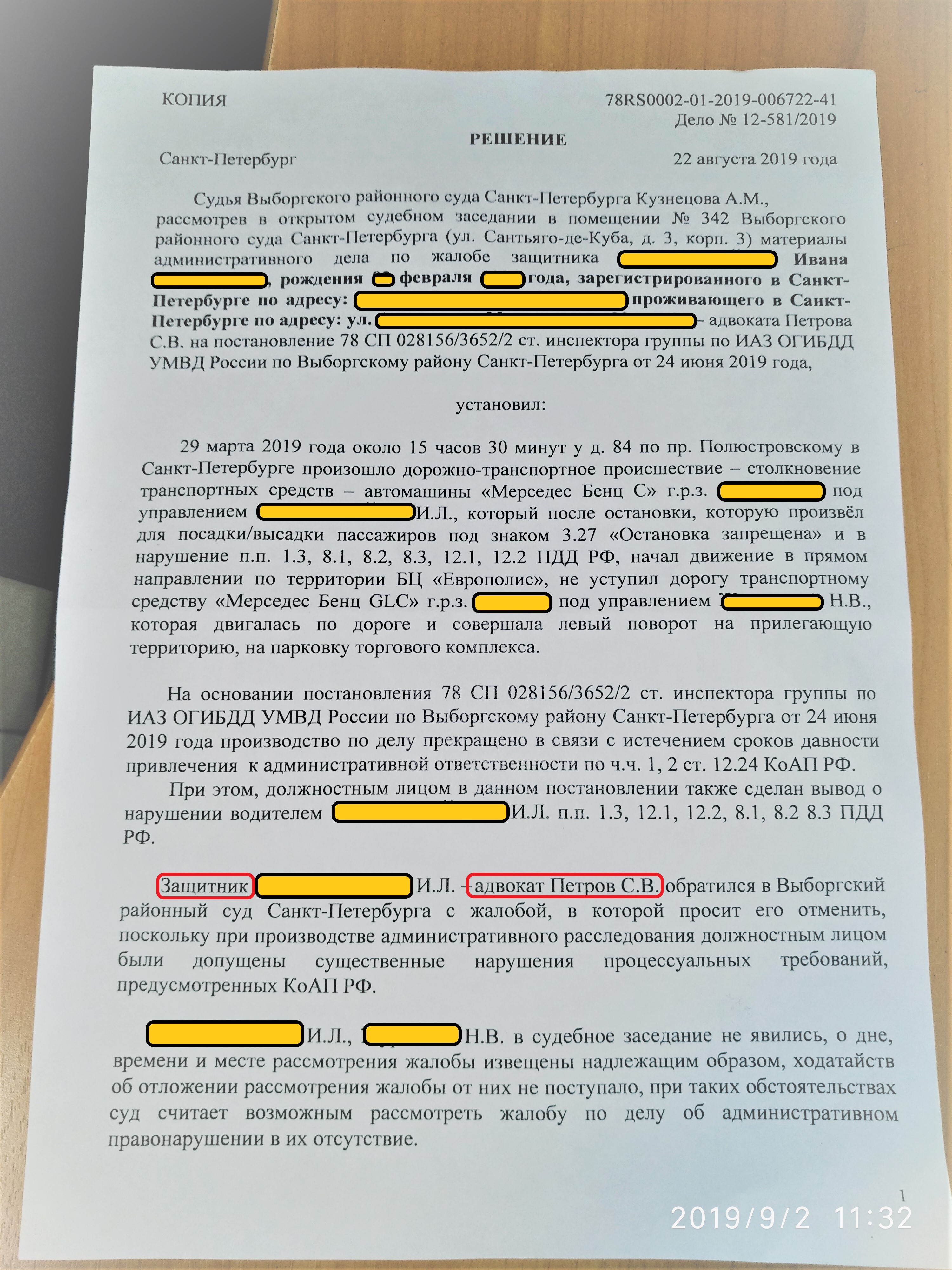 В другом случае инспектор ГИБДД по Выборгскому району Санкт-Петербурга вынес незаконное постановление. Обвинил водителя в совершении ДТП по ч.1 ст. 12.24 КоАП РФ. Производство по делу прекратил в связи с истечением срока давности привлечения к административной ответственности. Страховая отказала в выплате по ОСАГО. Водитель обратился за юридической помощью, чтобы оотменить постановление ГИБДД. Адвокат по ДТП обжаловал постановление в Выборгский районный суд Санкт-Петербурга. Суд выслушал доводы адвоката и вынес решение об исключении выводов инспектора ГИБДД о виновности водителя в ДТП. В этом случае даже не пришлось обжаловать решение в Санкт-Петербургском городском суде. После этого водитель получил выплату в страховой компании по ОСАГО.